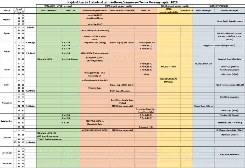 Elkészült a 2026. évre vonatkozó versenynaptár tervezet. A sokszínű játéklehetőségek miatt feltüntettük a szomszéd Szabolcs-Szatmár-Bereg Vármegye egyelőre biztos versenyeit is.